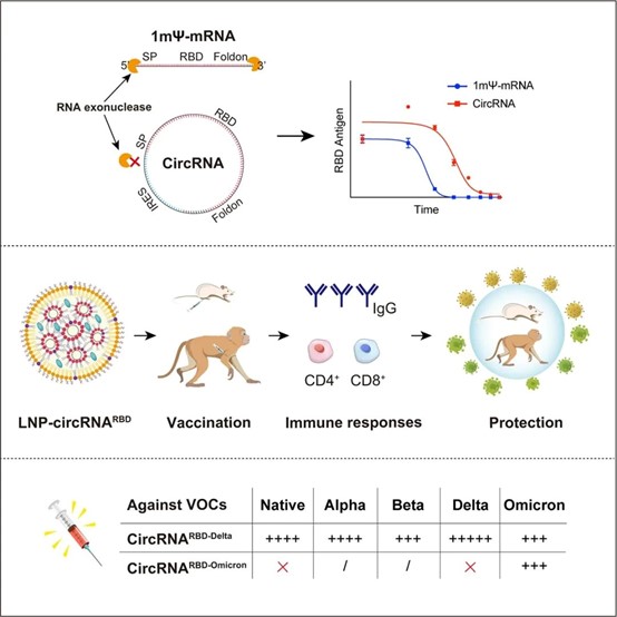 以上結(jié)果表明,針對(duì)新冠病毒德爾塔變異株設(shè)計(jì)的circRNARBD-Delta疫苗是具有廣譜保護(hù)力的新冠肺炎候選疫苗,該研究也為針對(duì)當(dāng)前新冠變異株迅速傳播的疫苗研發(fā)和接種策略提供了參考依據(jù)。同時(shí),該項(xiàng)平臺(tái)型技術(shù)的建立在感染性疾病、自身免疫病、罕見病以及癌癥的預(yù)防或治療中具有廣泛的應(yīng)用前景。